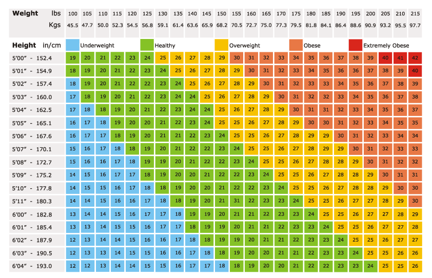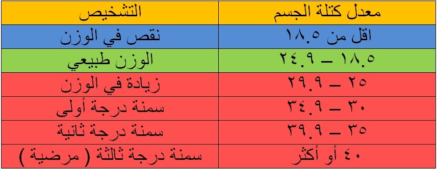 من المفيد أن نذكر أن المعيار المناسب للوزن ( أو مؤشر كتلة الجسم) يتراوح بين 18.5- 25 و نحصل على هذا المؤشر بقسمة الوزن (كغ) على مربع الطول (بالمتر)