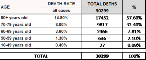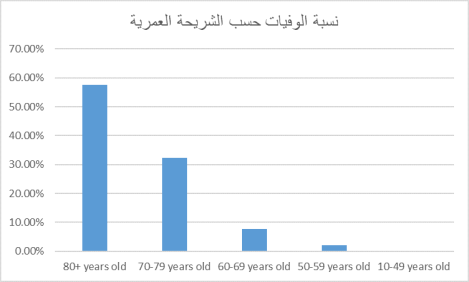 إن الضرر الأول سيشكل خطراً كبيراً على الشريحة المذكورة، إذ تهددها بالوفاة، فحتى تاريخ هذا المقال، بلغ عدد الوفيات أكثر من 30 ألف حالة وفاة، وتوضح الأرقام في الجداول المرفقة، أن الخطر يكاد يكون معدوماً في الشريحة العمرية من 0-49 سنة، بنسبة أقل من 1 بالألف من عدد الإصابات، في حين أن إجمالي الوفيات يعادل 97.81 % من إجمالي الوفيات في الشرائح العمرية الأكبر من 60 سنة.